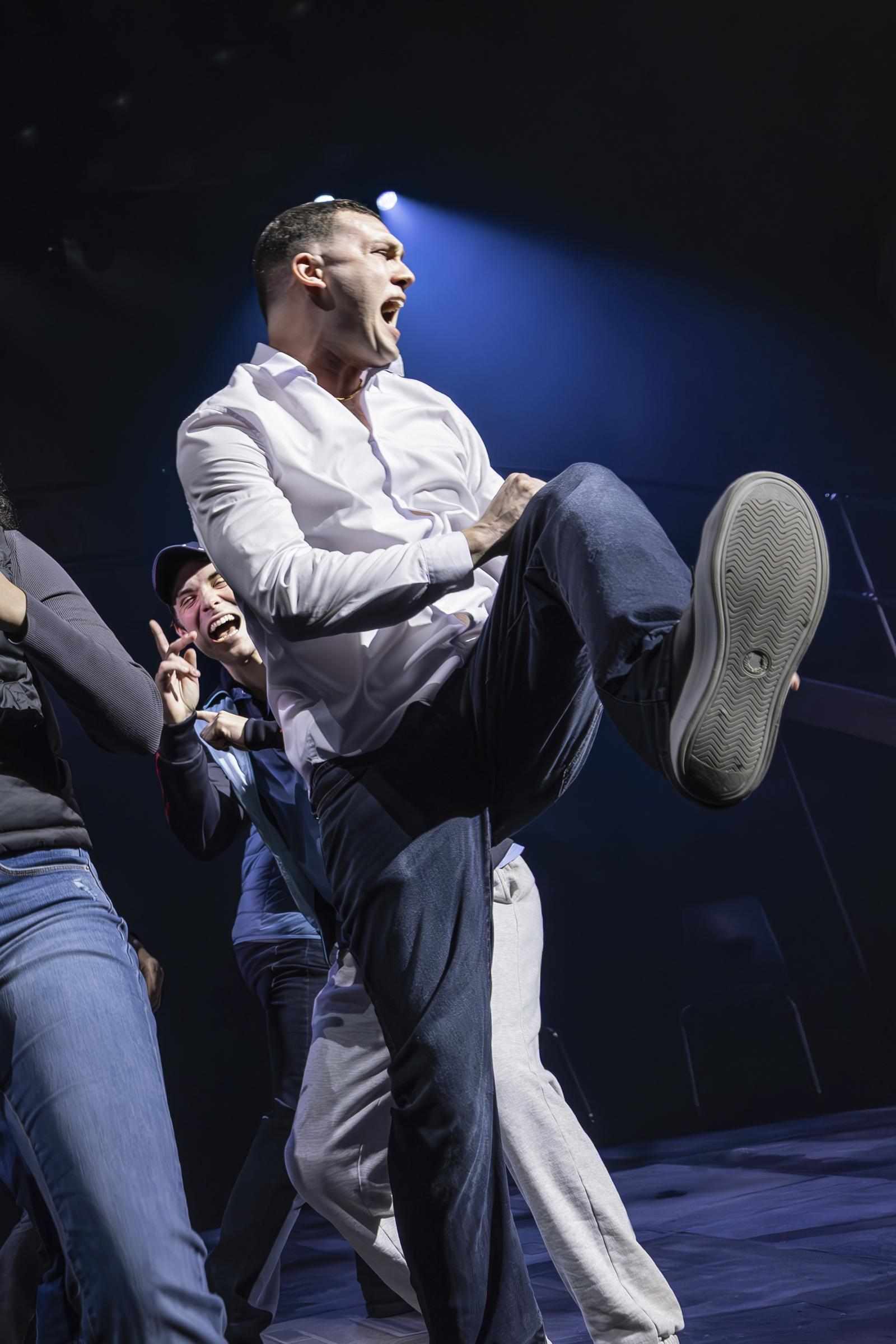 If you’ve never heard the term “restorative justice,” you’ll come to understand it in no uncertain terms while watching the British import Punch, James Graham’s searing drama that opened tonight at the Samuel Friedman; the opening salvo in the 2025-26 Manhattan Theatre Club Broadway season. In Adam Penford’s kinetically staged production, this true story has been adapted from Jacob Dunne’s autobiographical book Right from Wrong about his accidental killing of a young man. James Hodgkinson (the victim, 28 years old) and Dunne (the attacker, 19 years old) collided during a bar fight between strangers that went horribly wrong; a one-punch blow to the head that irrevocably changed the lives of two families. Aided by a talented ensemble in which eight of its nine-member cast convey multiple roles, it is the central performance of Will Harrison as Jacob that delivers the gravitas and, dare I say, dose of genius.