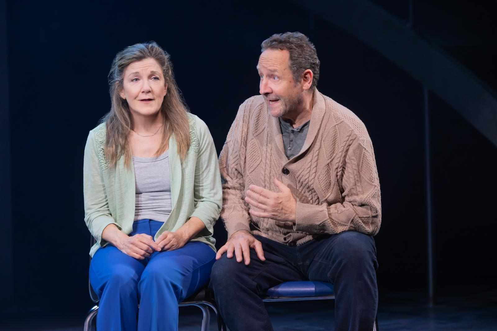 Will Harrison, an American actor doing a flawless British accent, gives a performance that is sure to make him one of the theatre’s next go-to actors. Though he’s been slowly building his resume with excellent work, what he delivers with this role is nothing short of heartbreaking. His raw physicality, his marvelous voice, and his access to multiple expressions of feeling complete the portrait of a memorable young man dealing with a crisis of unexpected dimensions. He is aided by the work of two theatre veterans, Victoria Clark and Sam Robards as the Hodgkinsons. The two-time Tony-winning Clark excels as Joan without singing a note (she plays a few other parts too), reminding us that those Tonys weren’t given solely for her musical gifts. And Robards, multi-cast as well, portrays her husband David with profound simplicity. Though working a good deal in film and television, his is a welcome return to Broadway after being away for 17 years.