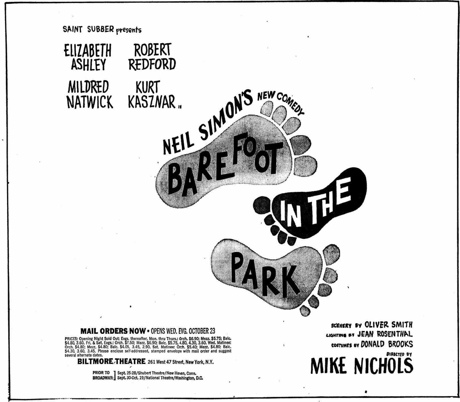 As one example of the revolutionary way with which the show was staged, during one rehearsal, Simon was observing one of the play's fight scenes and cozied up to Nichols, who was seated in the audience. "I think we should leave," Simon said. "This is too private a moment." As he further explains: "It was so private, I didn't think we should intrude on it, and I knew then it was spectacular." Nichols was aided in his efforts by the casting of the twenty-six year-old Robert Redford and the twenty-four year-old Elizabeth Ashley, who became break-out stars after Barefoot, even though it wasn't the Broadway debuts for either (Ashley had, in fact, won a Tony the previous season for Take Her, She's Mine, as old school a comedy as Barefoot was new).
