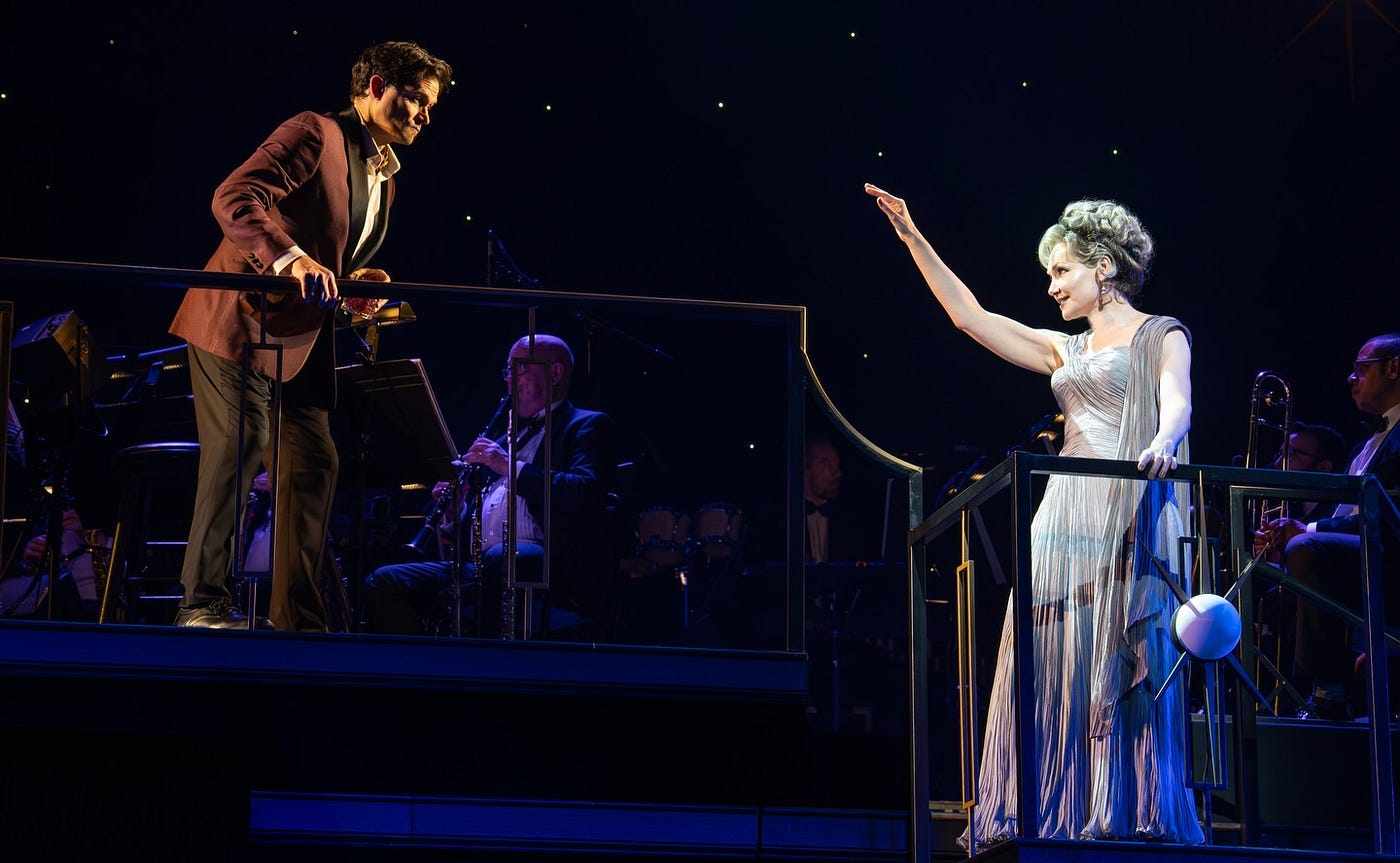 As Elvira, Katrina Lenk really hits her stride again. Blown away by her Tony-winning performance in The Band’s Visit (2017), it was bracing to see how Elvira elegantly suits the weirdness that makes Lenk such a captivating presence. It decidedly worked against her as Bobbie, in the gender-twisted revival of Company (2021). The task of trying to recreate what made Bea Lillie such a sensation has fallen to Andrea Martin, one of our greatest clowns. At seventy-nine (!), Martin is certainly game and uses her limber body beautifully (remember her hanging from a trapeze in Pippin thirteen years ago?). However, she is severely limited to what she can do with script in hand so perhaps in a full production and with more rehearsal time, her endlessly inventive comic creativity could have been used to greater effect.