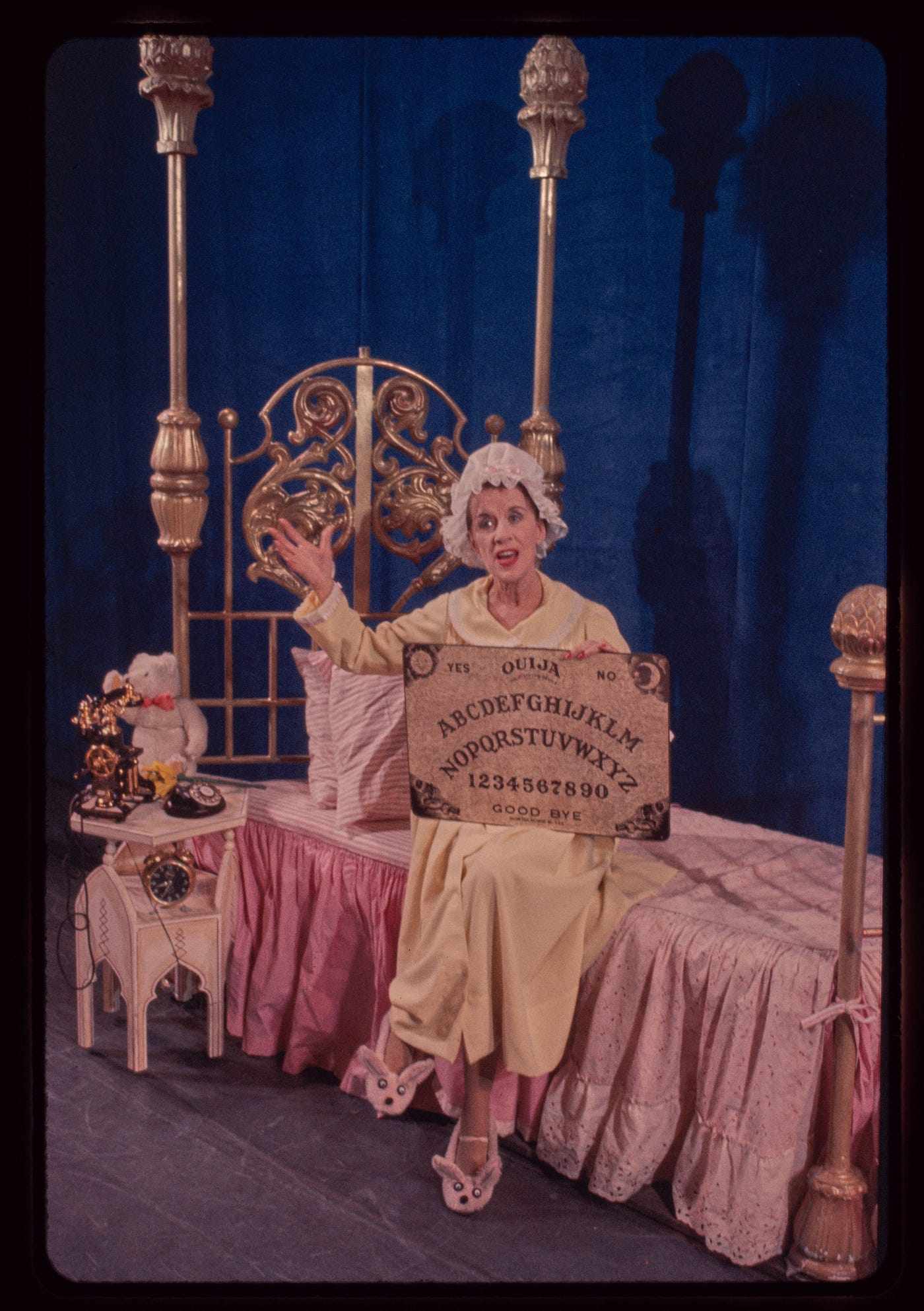 Both Blithe Spirit and High Spirits tell the story of mystery writer Charles Condomine and his second wife Ruth who, by holding a séance at their home, inadvertently conjure up Charles’s first wife Elvira, dead for seven years. With only slight changes in the plotting and a whole new ending, the major differences were in finding ways to squeeze in a chorus (not successfully as it turned out) and to elevate the supporting character of Madame Arcati to star status, the self-described “happy medium,” responsible for Elvira’s resurrection. Why expand the part? Because Beatrice Lillie was signed to play it, that’s why.