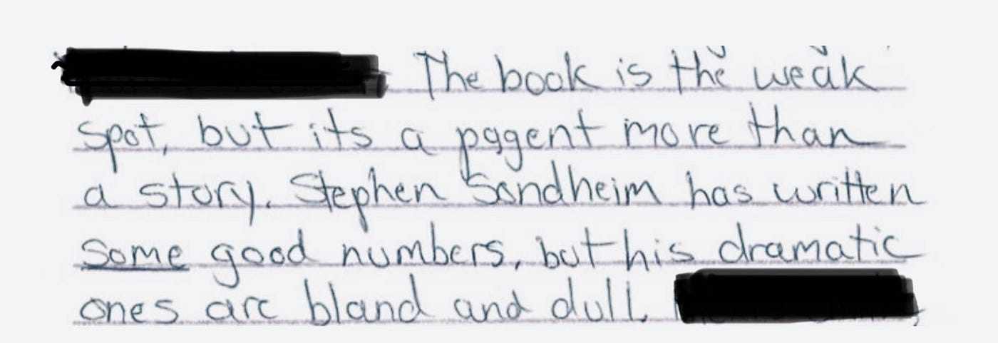 “Some” good numbers. Good grief! At least I barely redeem myself with my final line, “Follies is a very good show,” proving that at least I liked it. But let’s face it: the sharpness of the manner in which the show hit its targets went over my head.