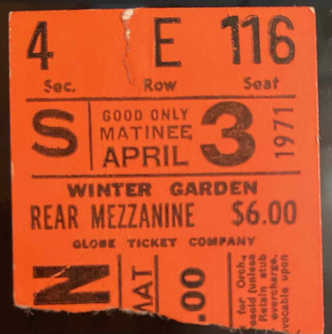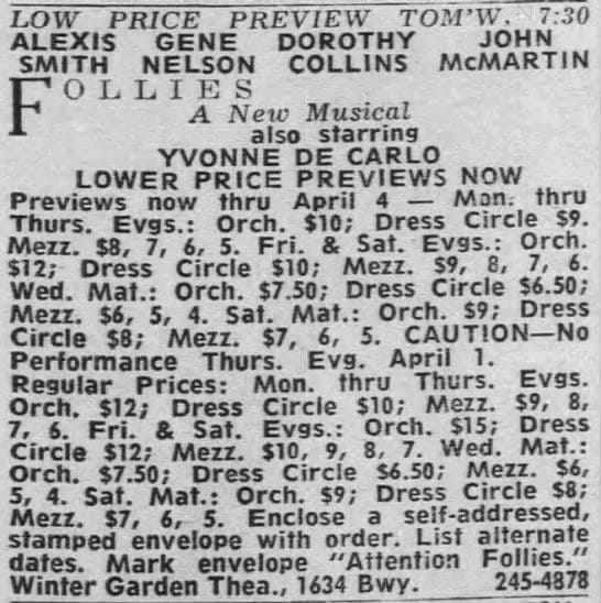 Funnily enough, for Follies, I bought a $6 seat—at the time, the most I ever paid for a show. Why? Well, with fifty years in the rear view mirror it’s not easy to recall the specifics, though it’s possible I leaped at the chance to sit in a better seat for only $1 more. And it must be pointed out that $5 was steep for the cheapest ticket at a Saturday matinee back then. The season’s biggest hit No, No, Nanette had opened in January and was charging $5 for the last row as well, but I got around that by attending a Wednesday matinee and paying only $3 (I was on a strict budget). And though Follies was offering a preview matinee for $4 on Wednesday afternoons, it would have entailed taking a day off from school, and late March and early April didn’t provide a holiday for that as Nanette did in February (all this stuff was carefully plotted by me back in the day, let me tell you). The theatre where Follies was playing is probably the reason I went for the better seat. My three previous visits to the Winter Garden were all in the cheapest seats and all had one-word titles: Mame, Jimmy and Georgy. If you have ever had the misfortune to be seated upstairs on the side it’s not an ideal experience (the Winter Garden is WIDE!). Much of the time it affords you the chance to watch a lot of stage hands backstage at work (or at leisure).